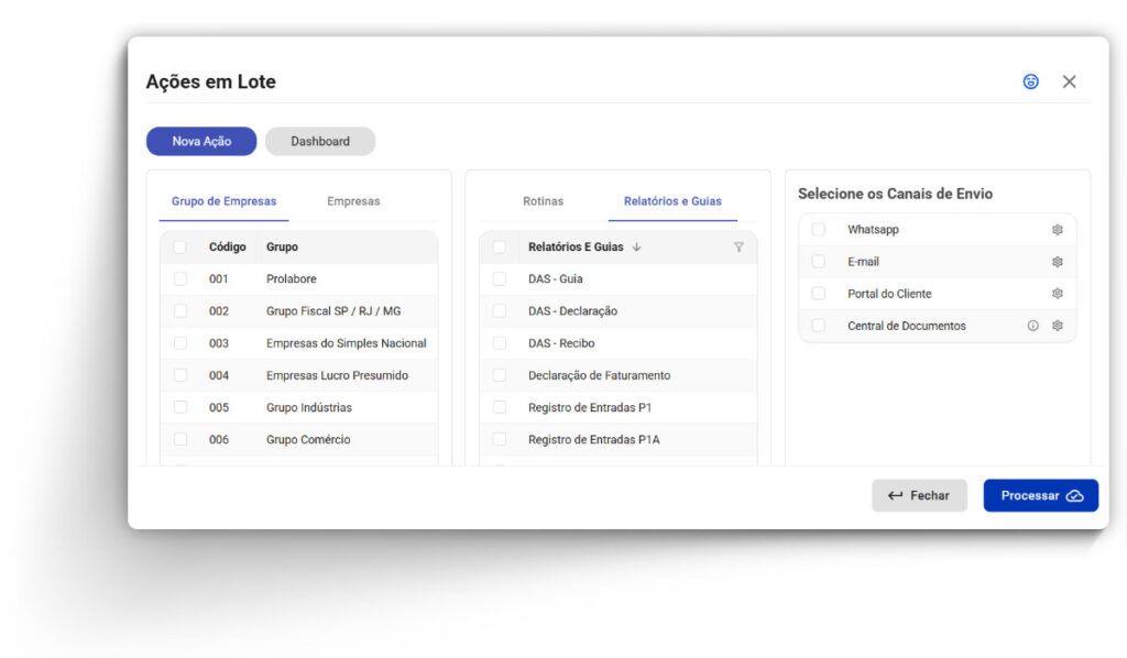 Realize rotinas fiscais em várias empresas ao mesmo tempo, eliminando a necessidade de processos manuais repetitivos. Com as ações em lote, você ganha escala, agilidade e precisão na execução das obrigações.