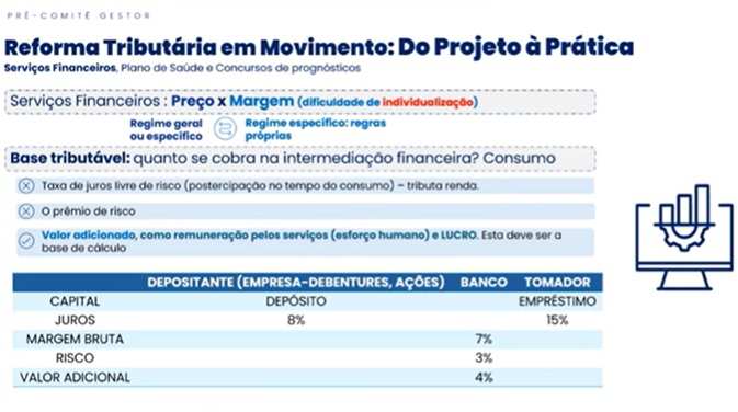 - Base de cálculo: apuração por margem (spread) entre operações ativas e passivas. O auditor Antonio Alves destacou que esse é o ponto de partida para a imposição da DERE.