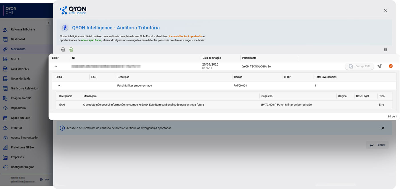 Integrada ao sistema de armazenamento de XML da QYON, ela analisa cada documento fiscal eletrônico com precisão, identificando inconsistências e prevenindo erros tributários antes que eles gerem riscos para o negócio.